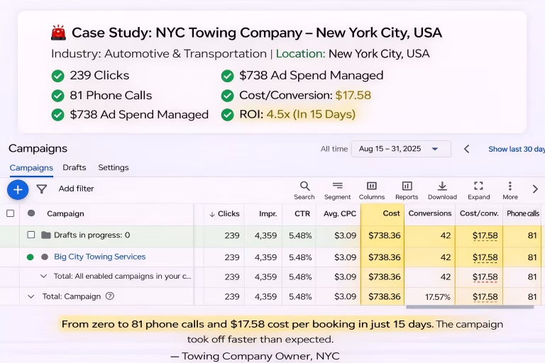 “From launch to results in just 15 days. Google Ads quickly started generating emergency towing calls with a strong return on ad spend.”